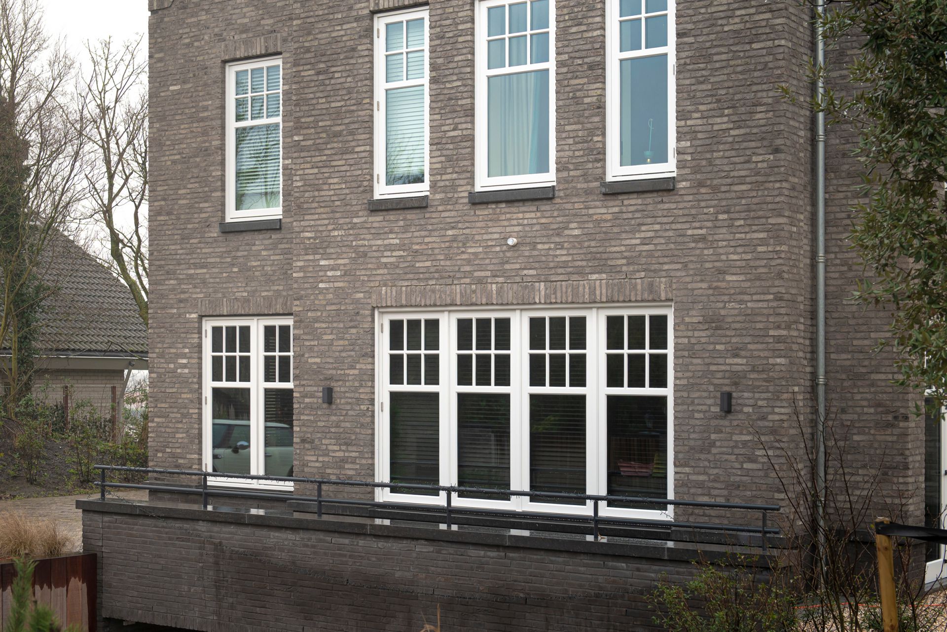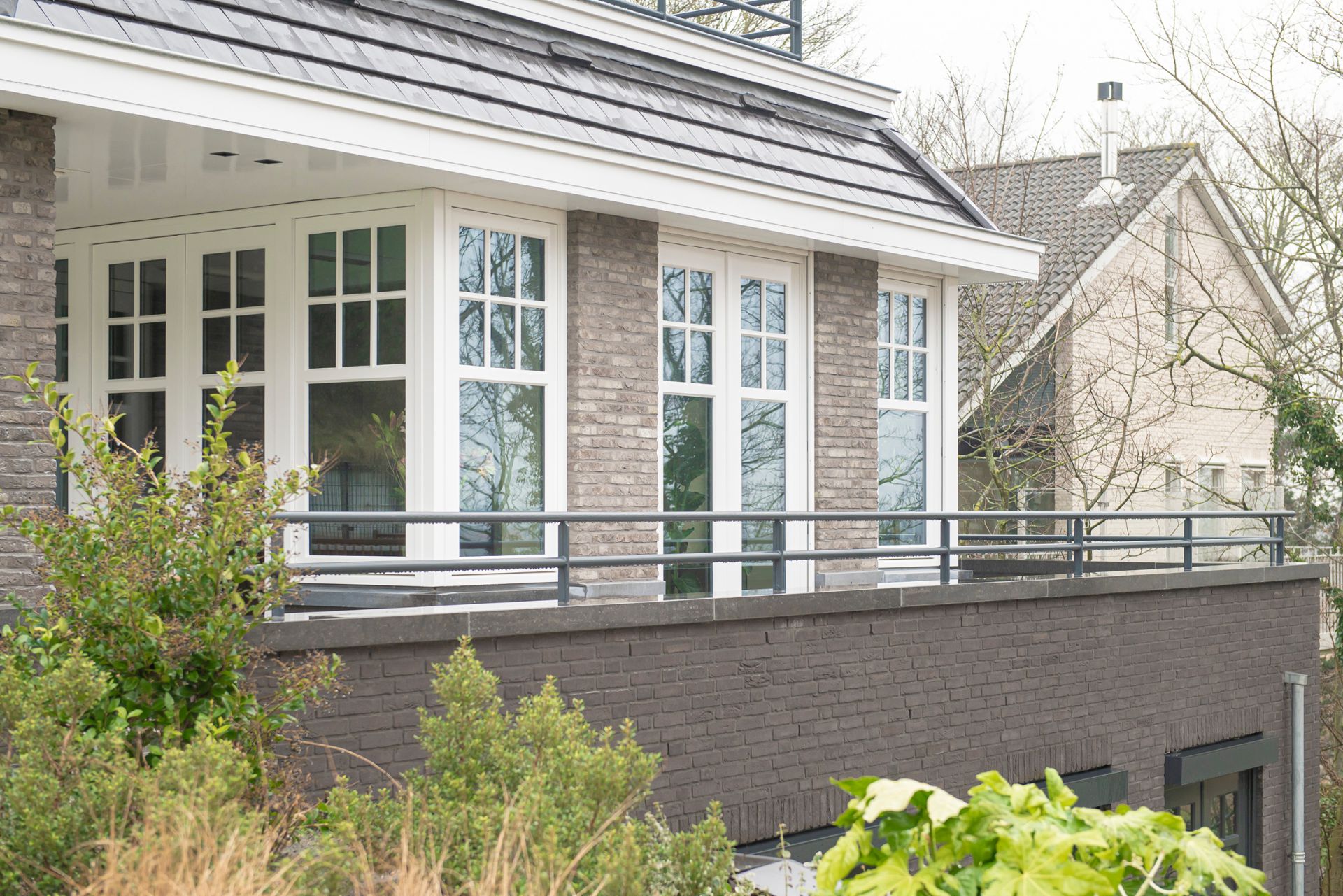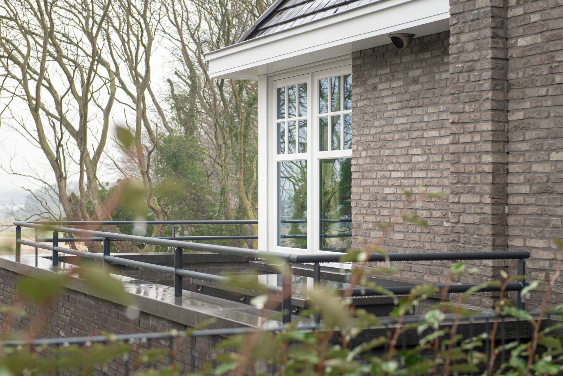 Houten kozijnen in grijs afgelakt, voorzien van authentieke roedeverdeling, HR++ glas en detaillering in lijn met klassiek metselwerk.