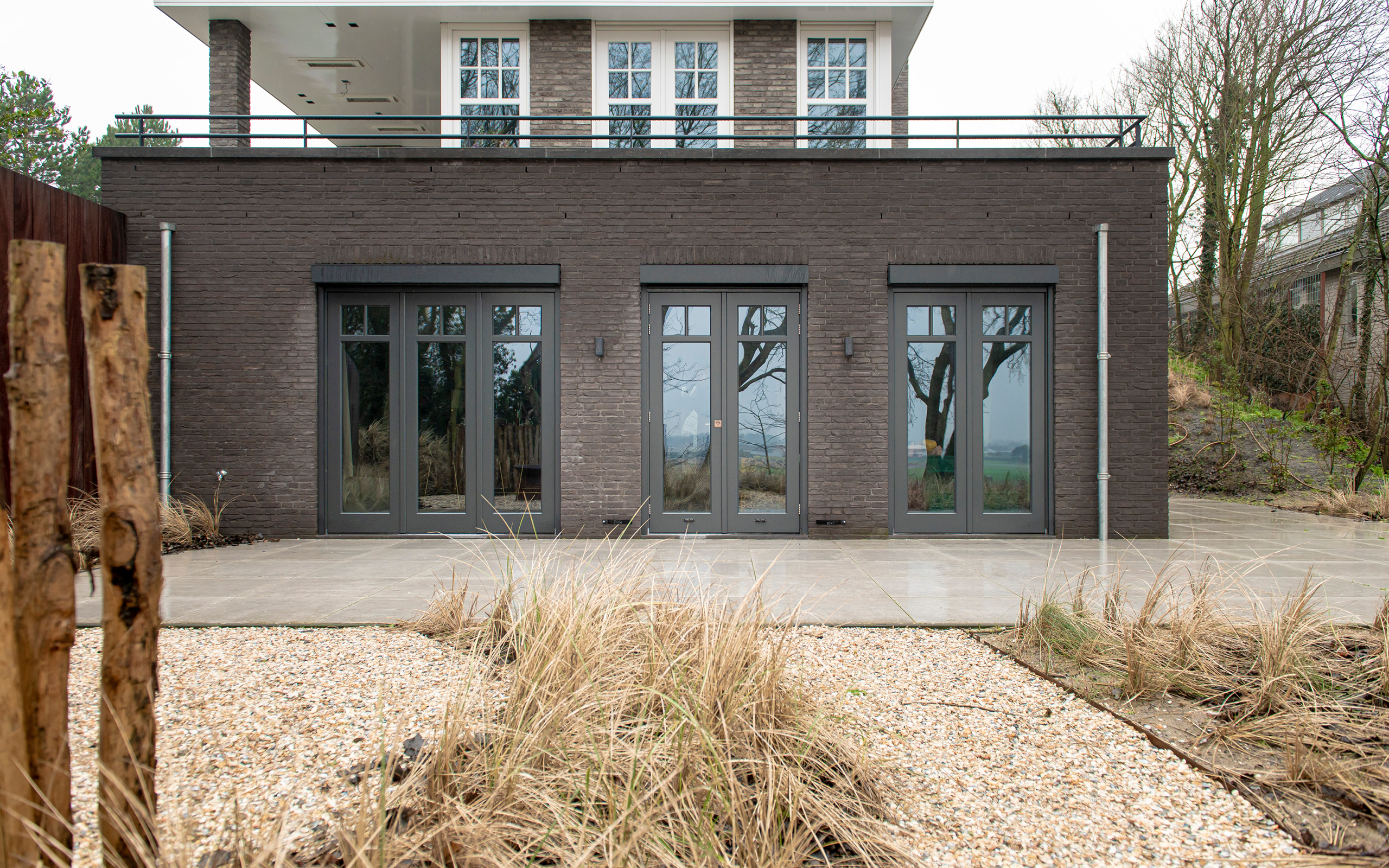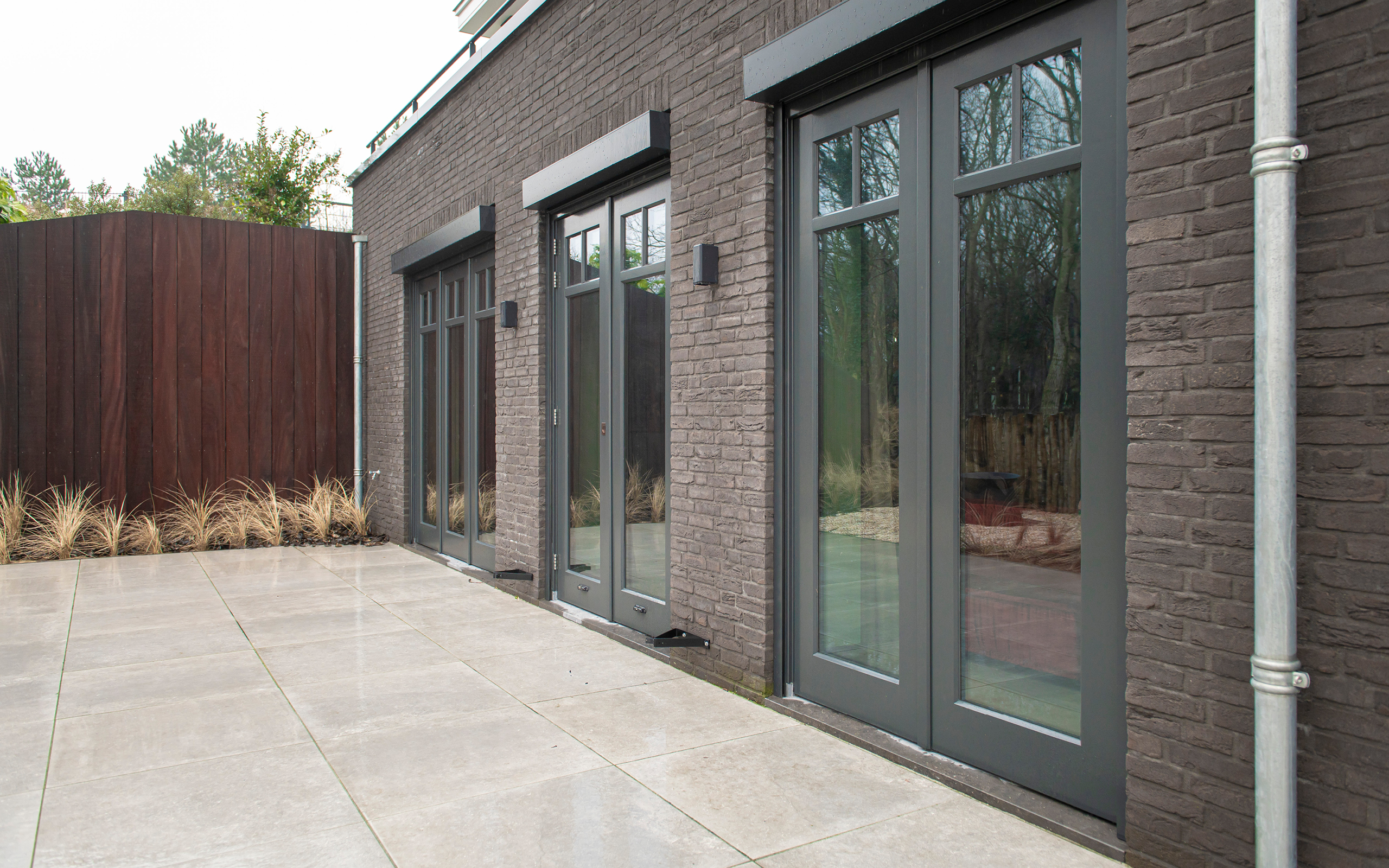 Volledig maatwerk in houten kozijnen, ramen en deuren in diepe grijstint. Realisatie van openslaande tuindeuren, vaste ramen en voordeuren passend bij de architectuur.