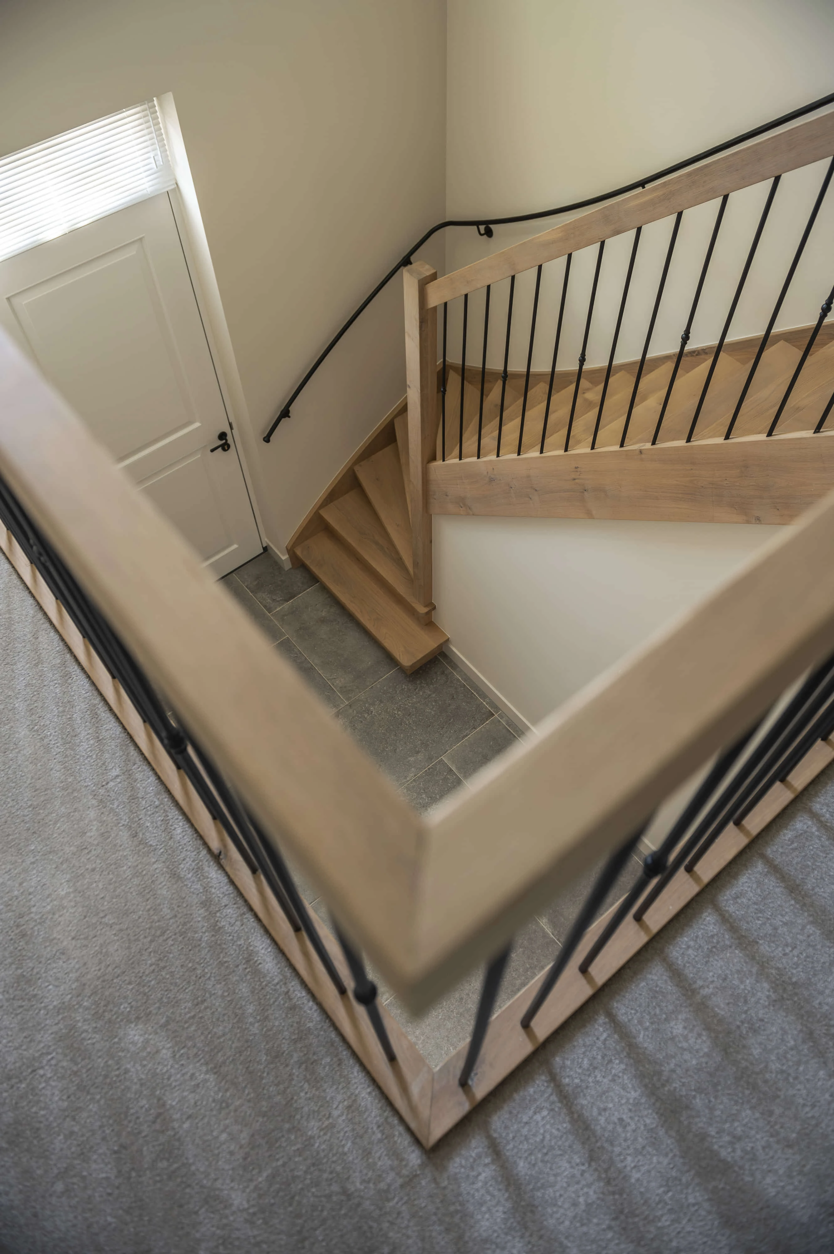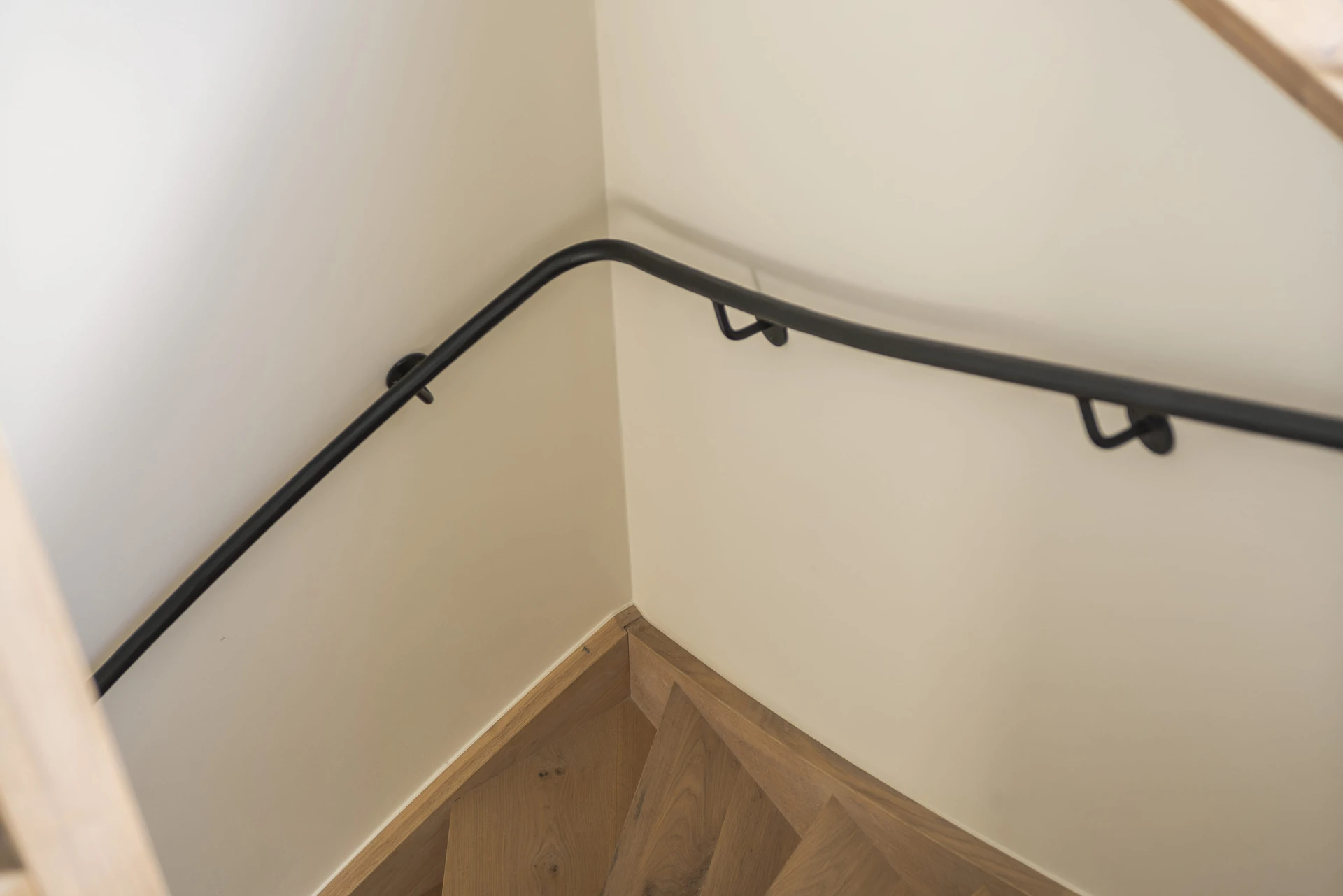 Een op maat gemaakte houten trap met stalen spijlen en een strakke stalen trapleuning, perfect passend bij de landelijke woonstijl van de opdrachtgever.