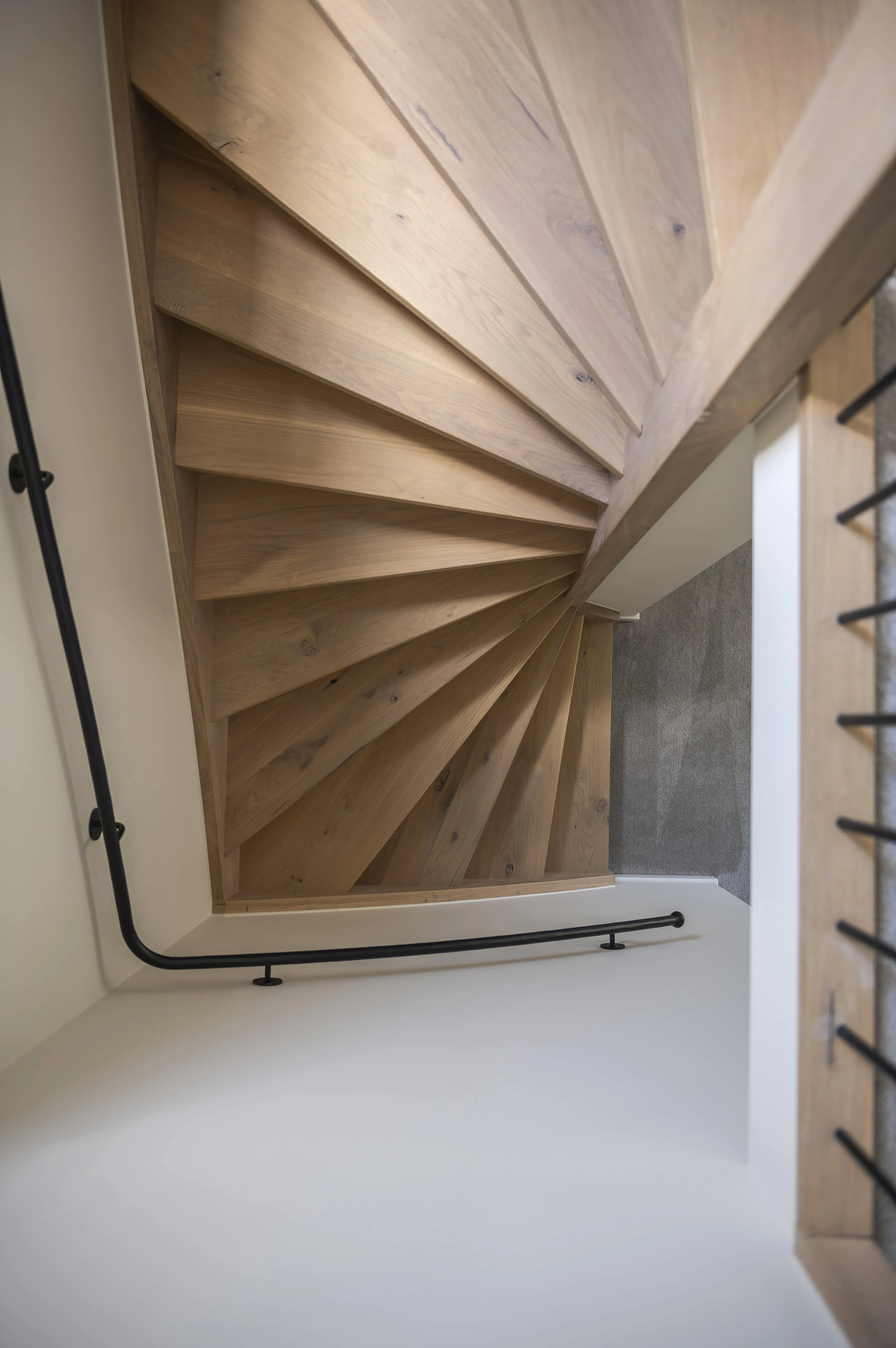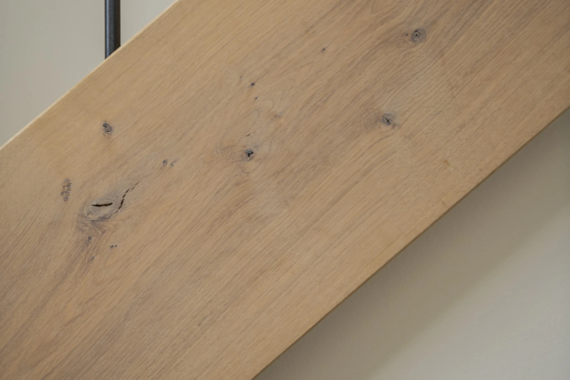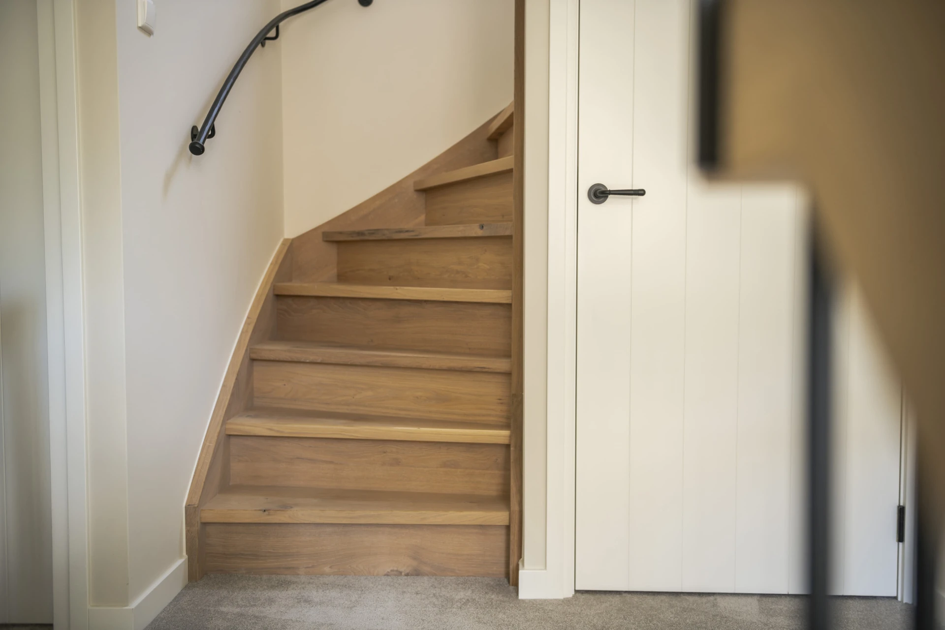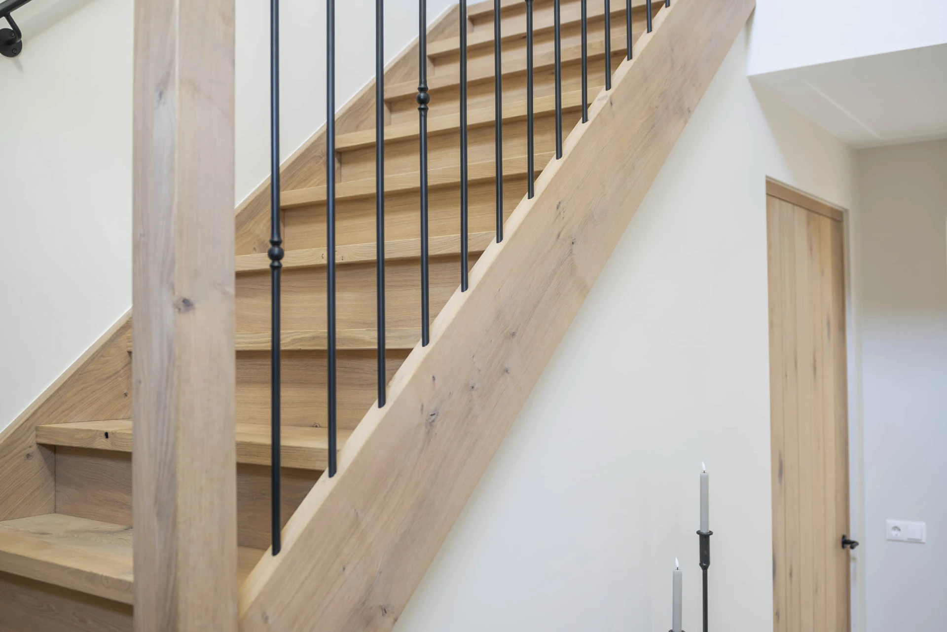 Houten trap uitgevoerd in hoogwaardig massief hout met natuurlijke afwerking. Stalen spijlen en trapleuning zijn gepoedercoat voor een duurzame en onderhoudsvriendelijke uitstraling.