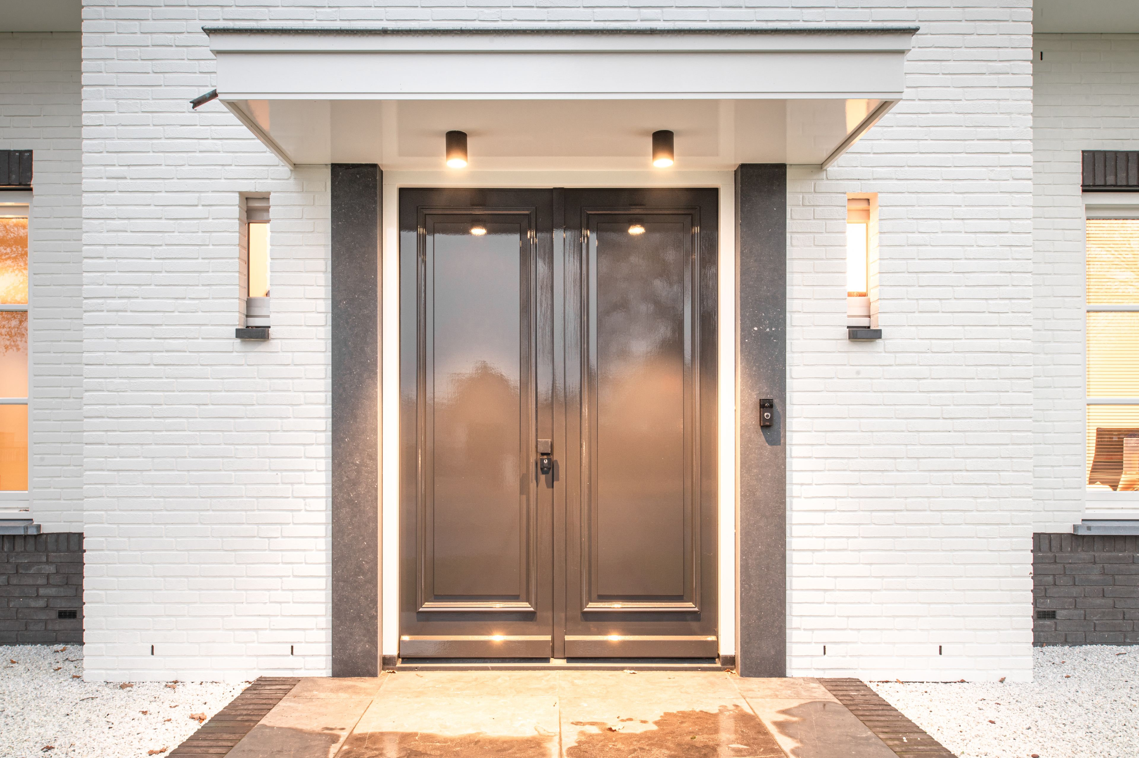 Mahonie kozijnen gegrond in RAL 9010, dubbele paneeldeuren met sierlijstwerk en weldorpel als voordeur en twee eikenhouten trappen met stalen hekwerk.