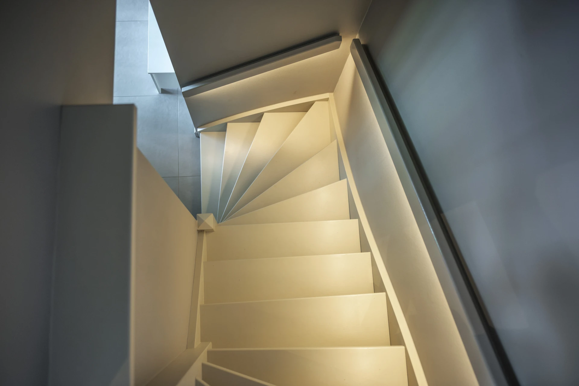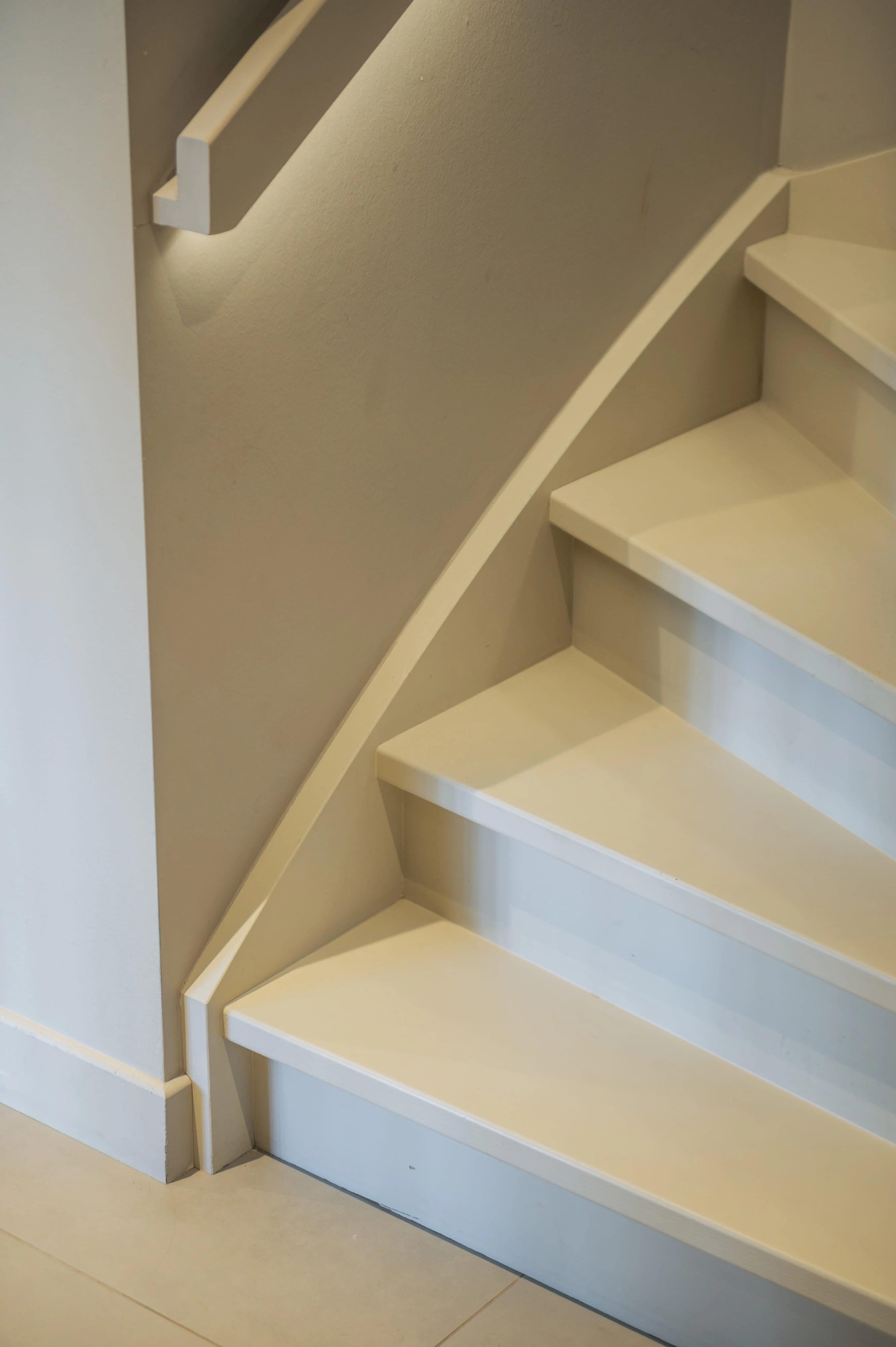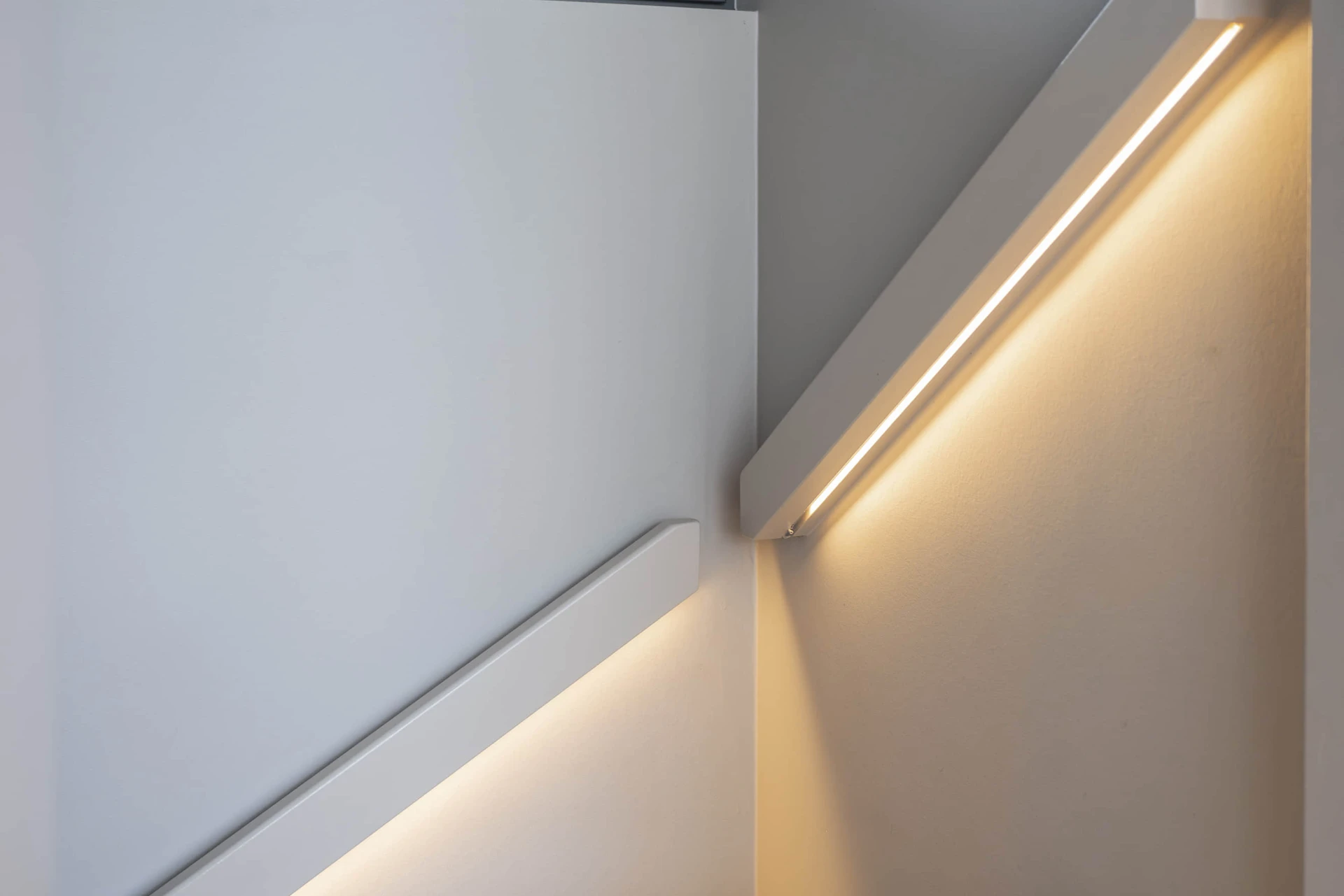 Trap met overstekende treden uitgevoerd met een naadloos afgewerkte houten trapleuning. De trapleuning is voorzien van geïntegreerde LED-strips die zorgen voor een gelijkmatige en zachte lichtverdeling.