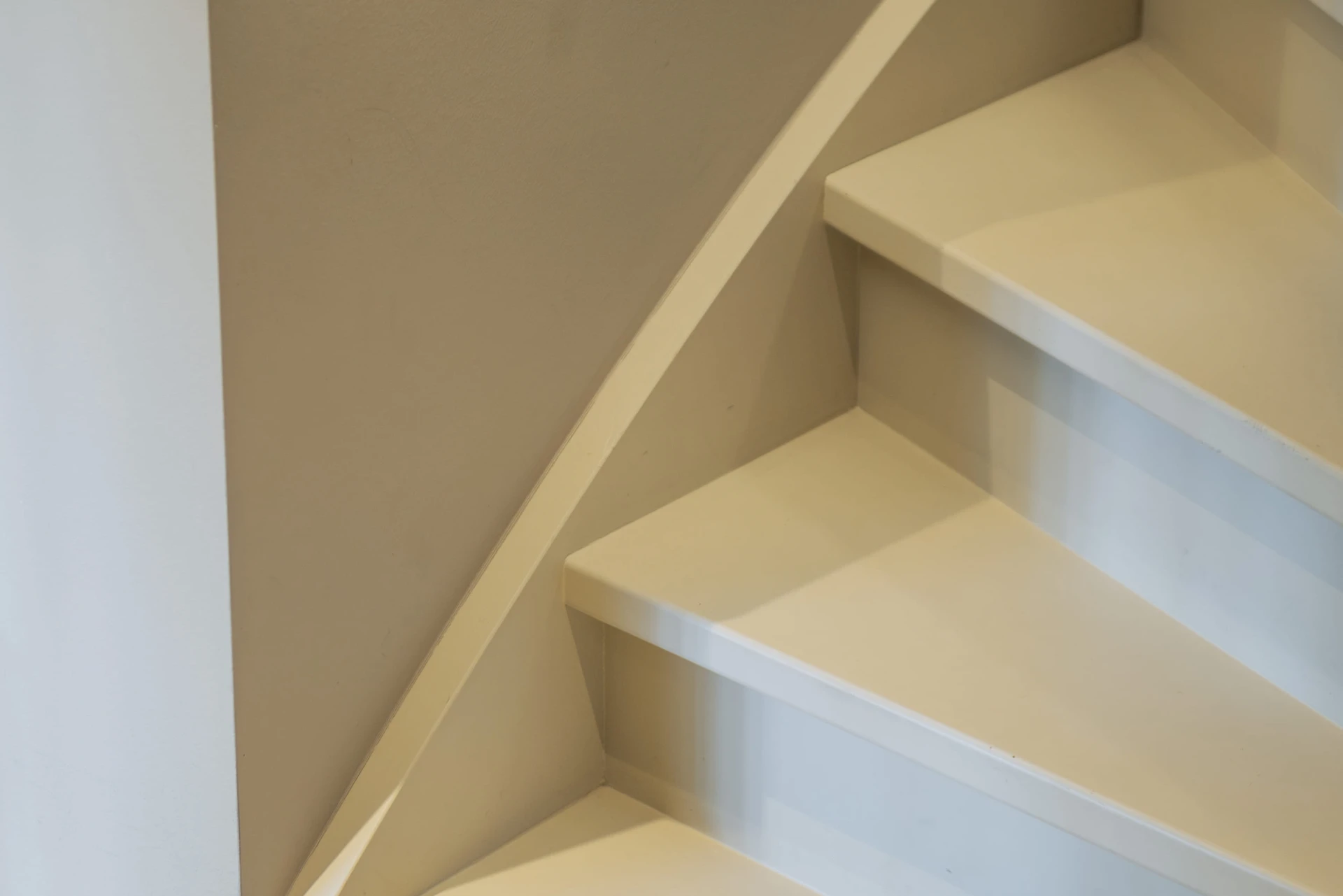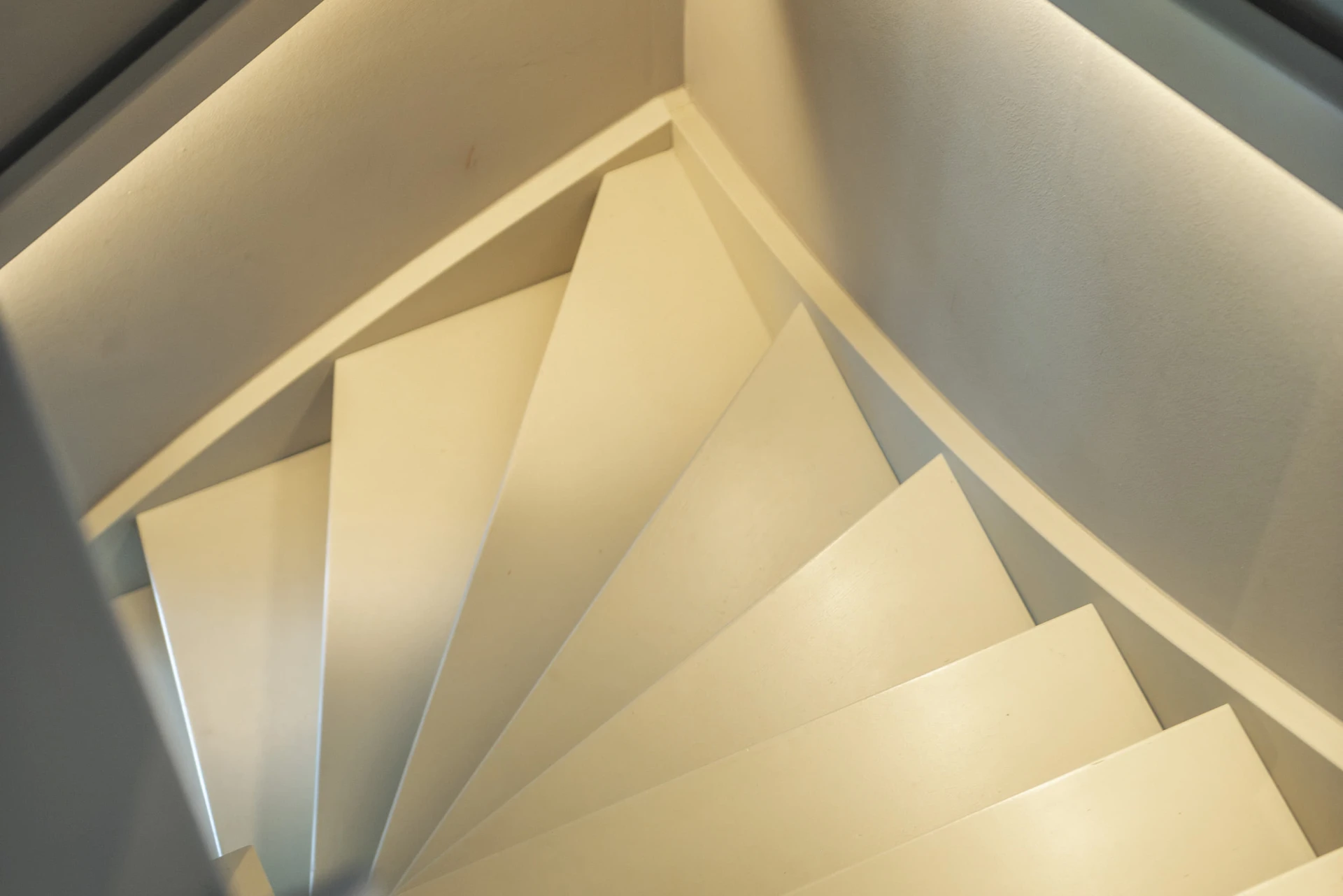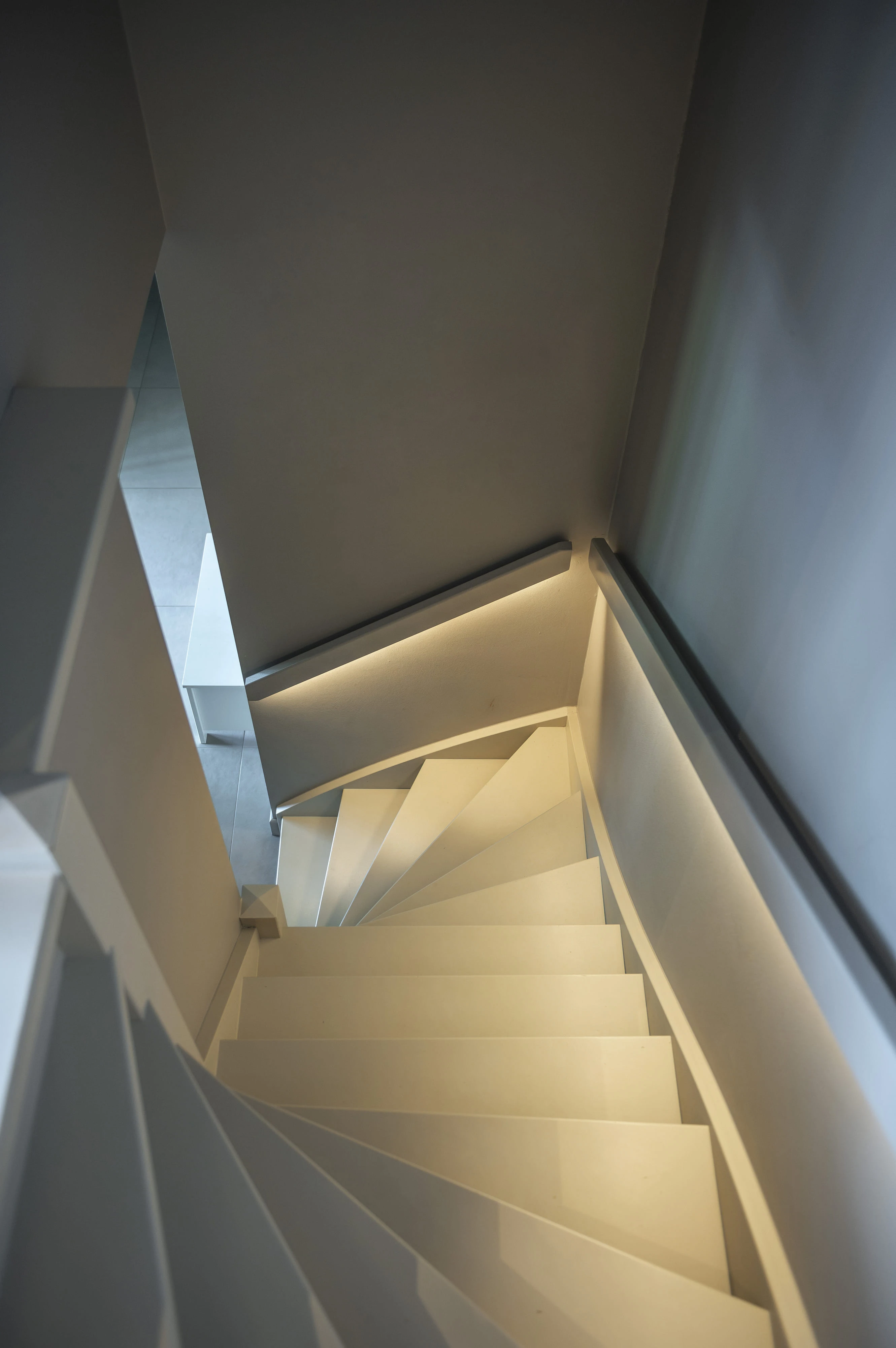 Trap met overstekende treden uitgevoerd met een naadloos afgewerkte houten trapleuning. De trapleuning is voorzien van geïntegreerde LED-strips die zorgen voor een gelijkmatige en zachte lichtverdeling.