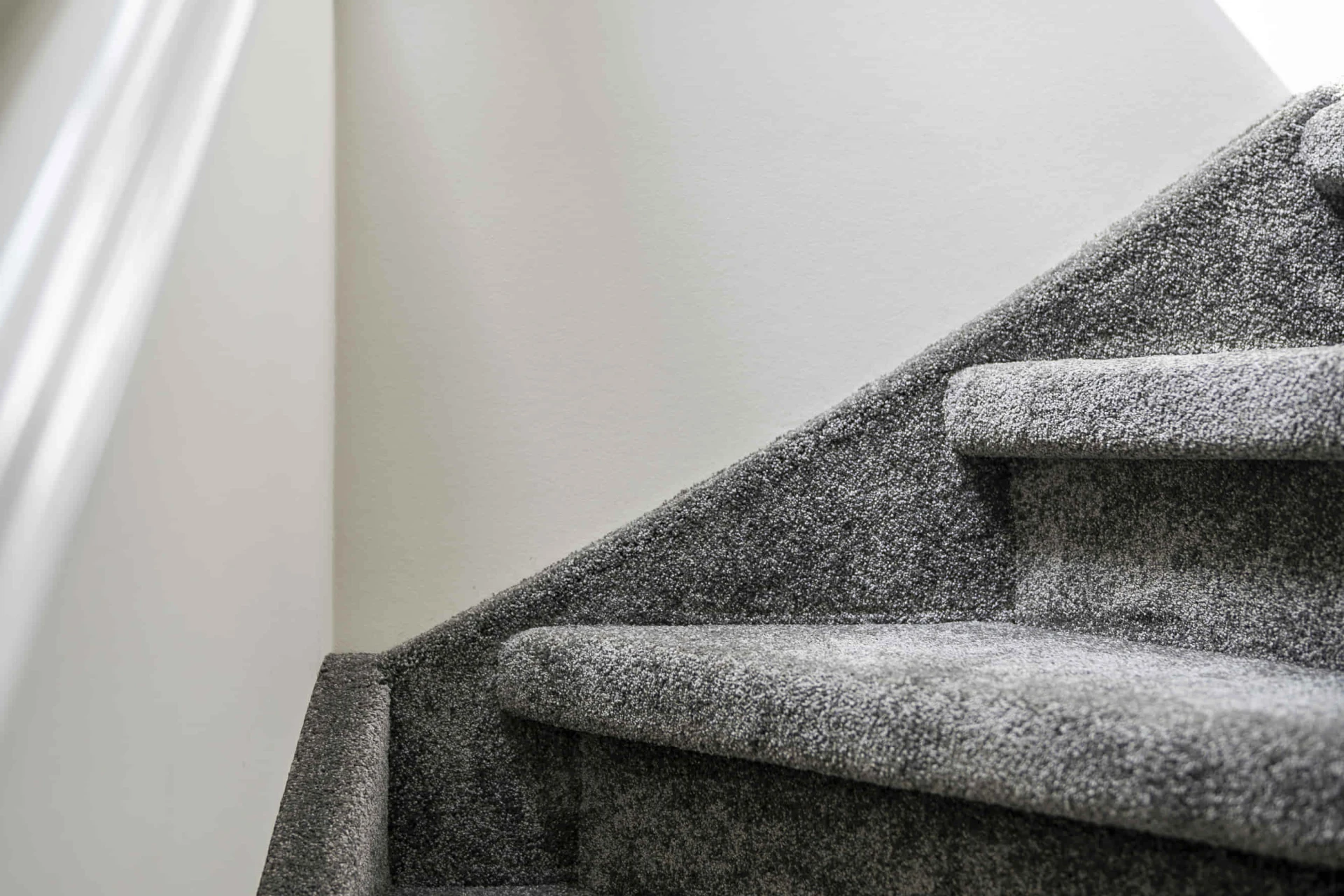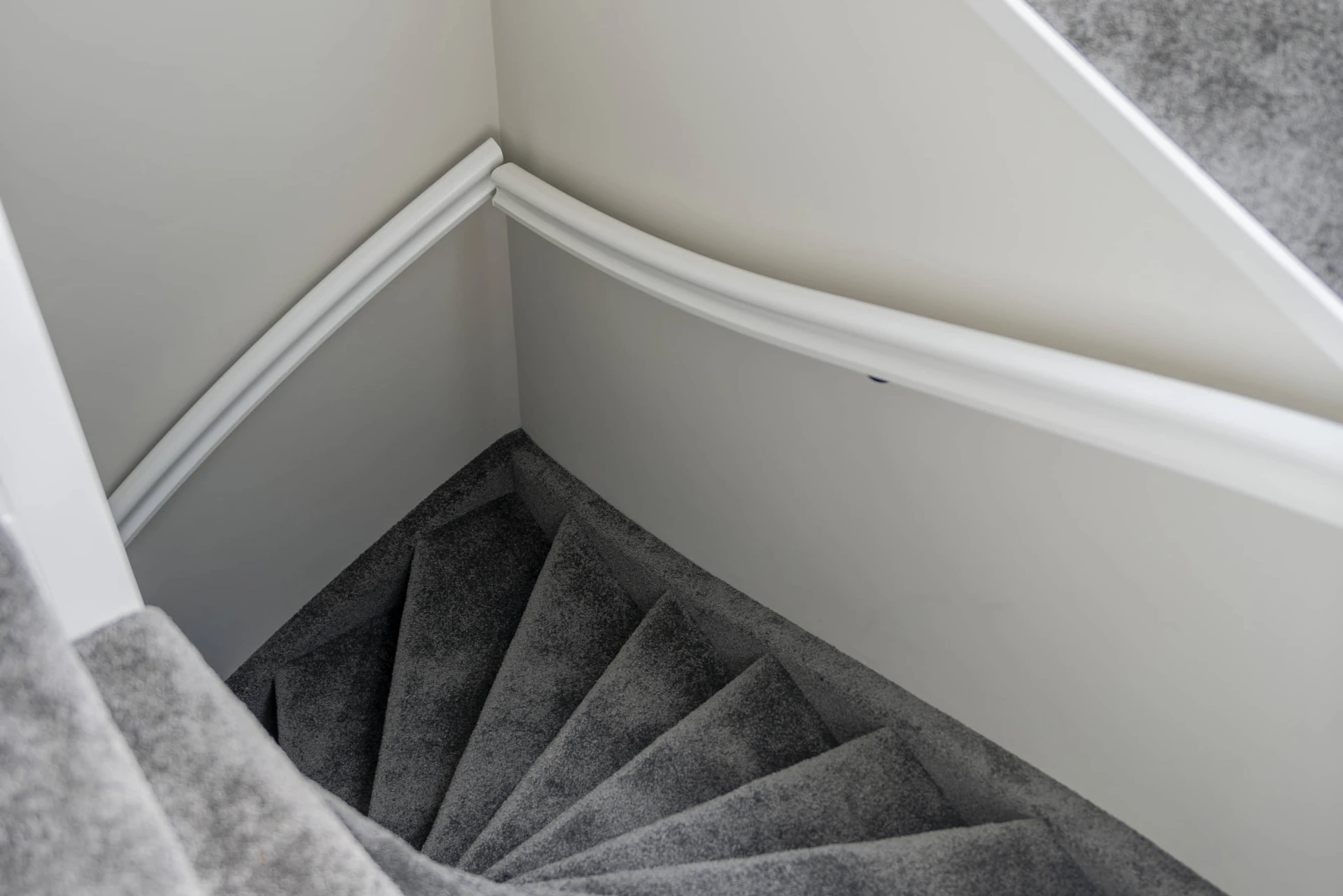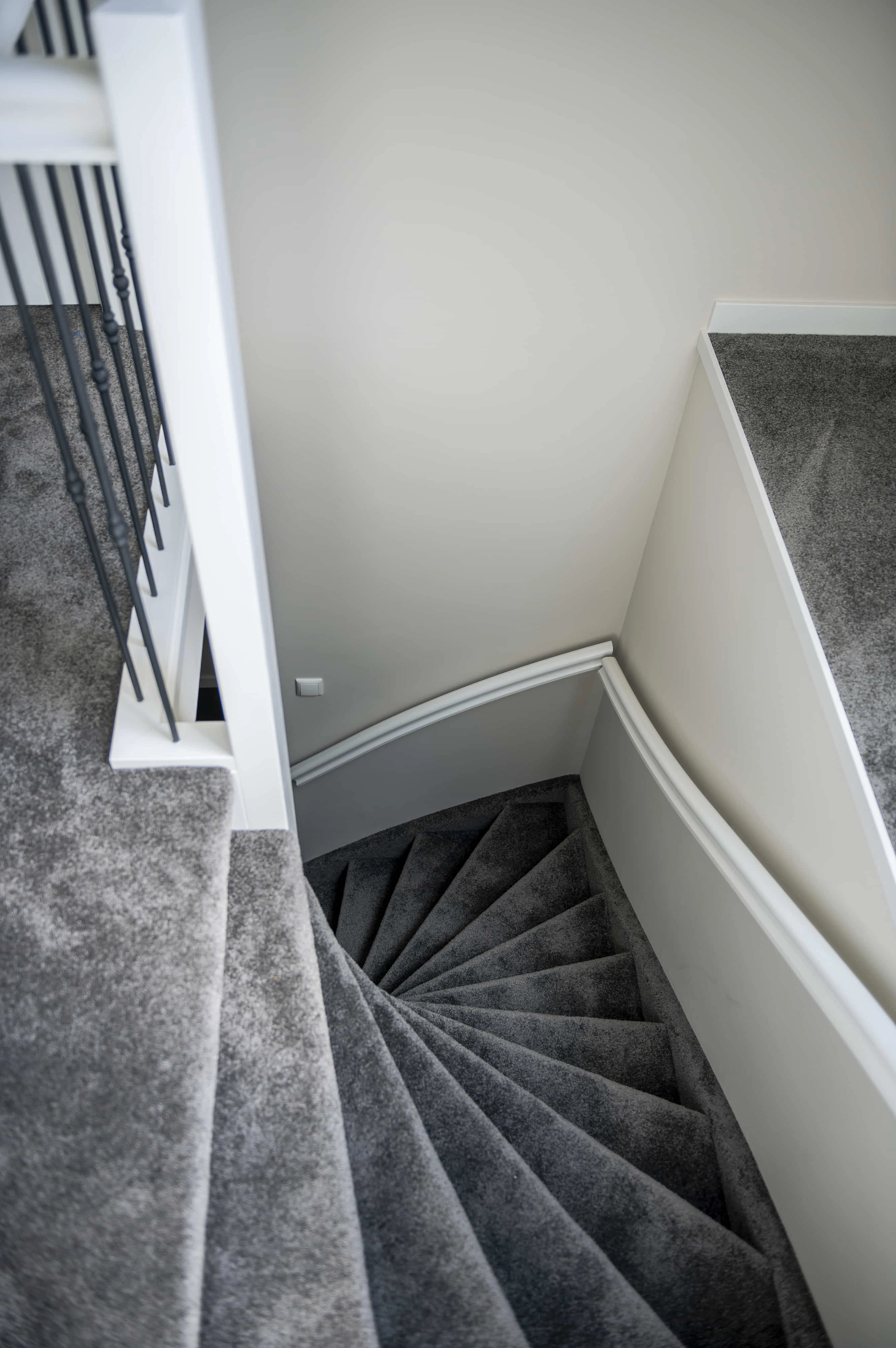 Een trap met tapijt bekleed volgens de wensen van de klant, met een zachte, slijtvast en onderhoudsvriendelijk oppervlak.