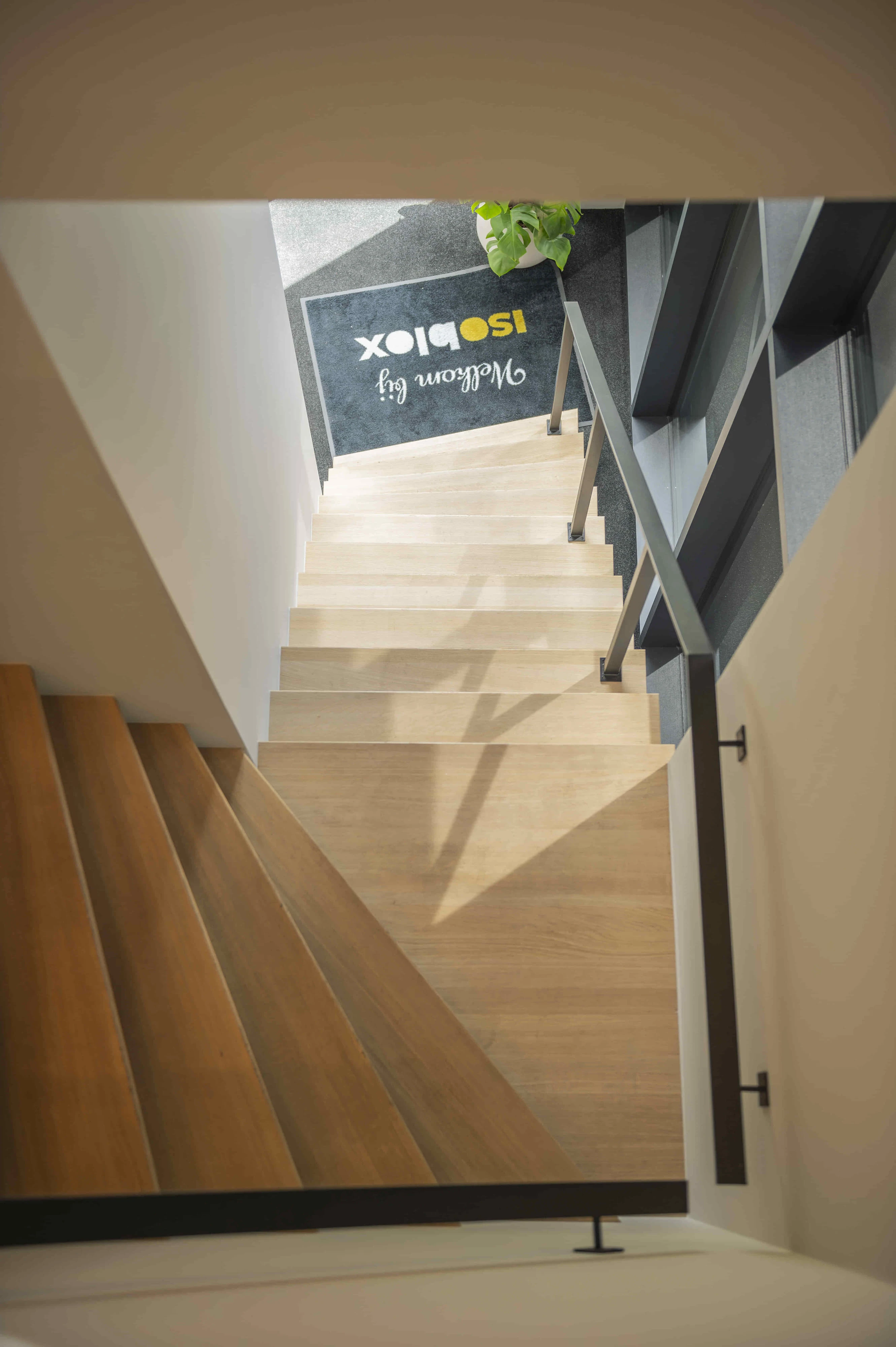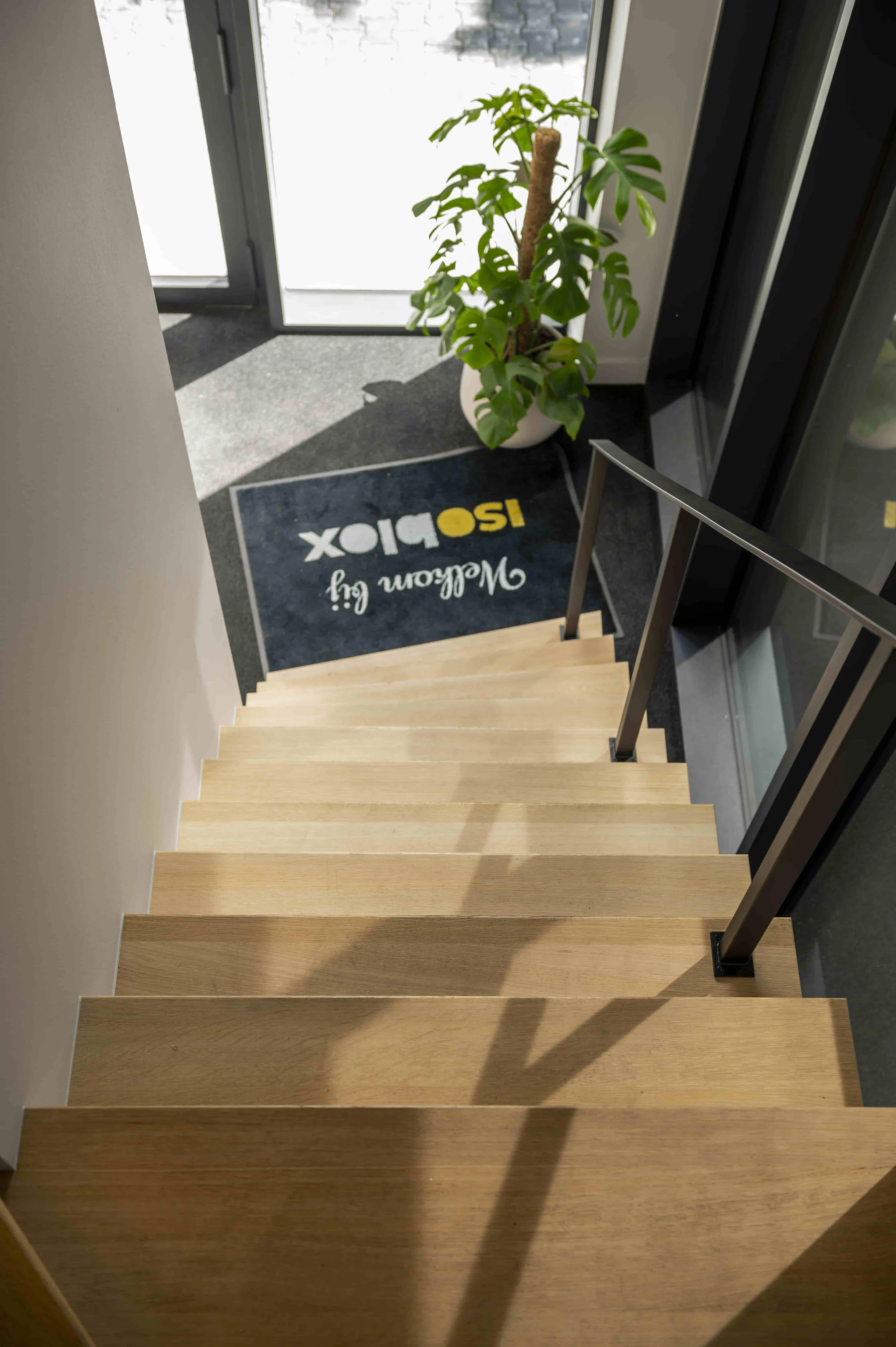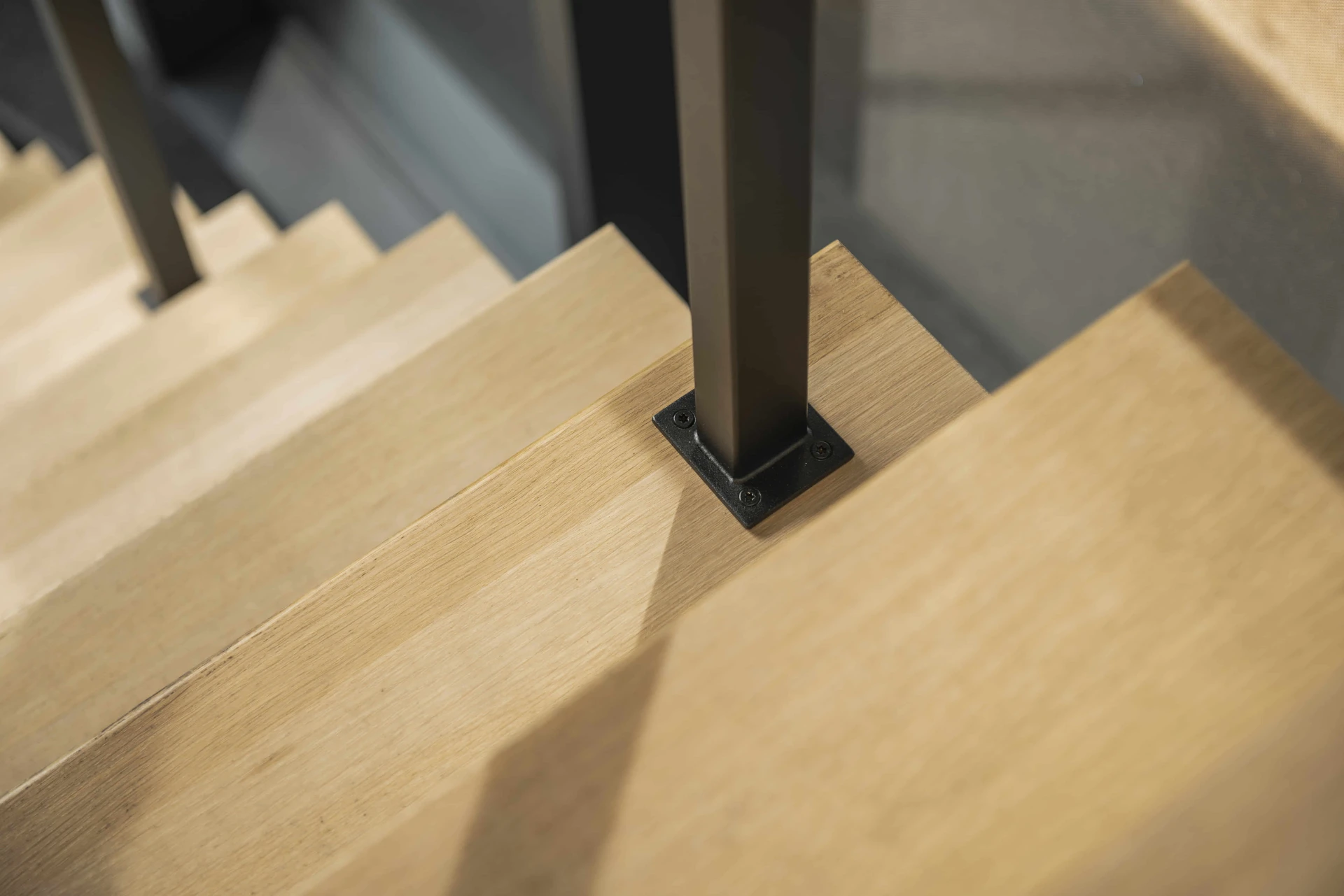 Een technische blikvanger in een industriële ruimteVoor een modern bedrijfspand realiseerden we een vrijstaande houten keepboomtrap met ingekroosde stootborden. Deze constructie vraagt om precisie in de uitvoering én oog voor esthetiek. De slanke belijning van de keepboom geeft de trap een moderne uitstraling, terwijl de ingekroosde stootborden zorgen voor extra verfijning in detail. Het resultaat is een robuuste trap die zowel functioneel als visueel indruk maakt binnen de strakke lijnen van de bedrijfshal.