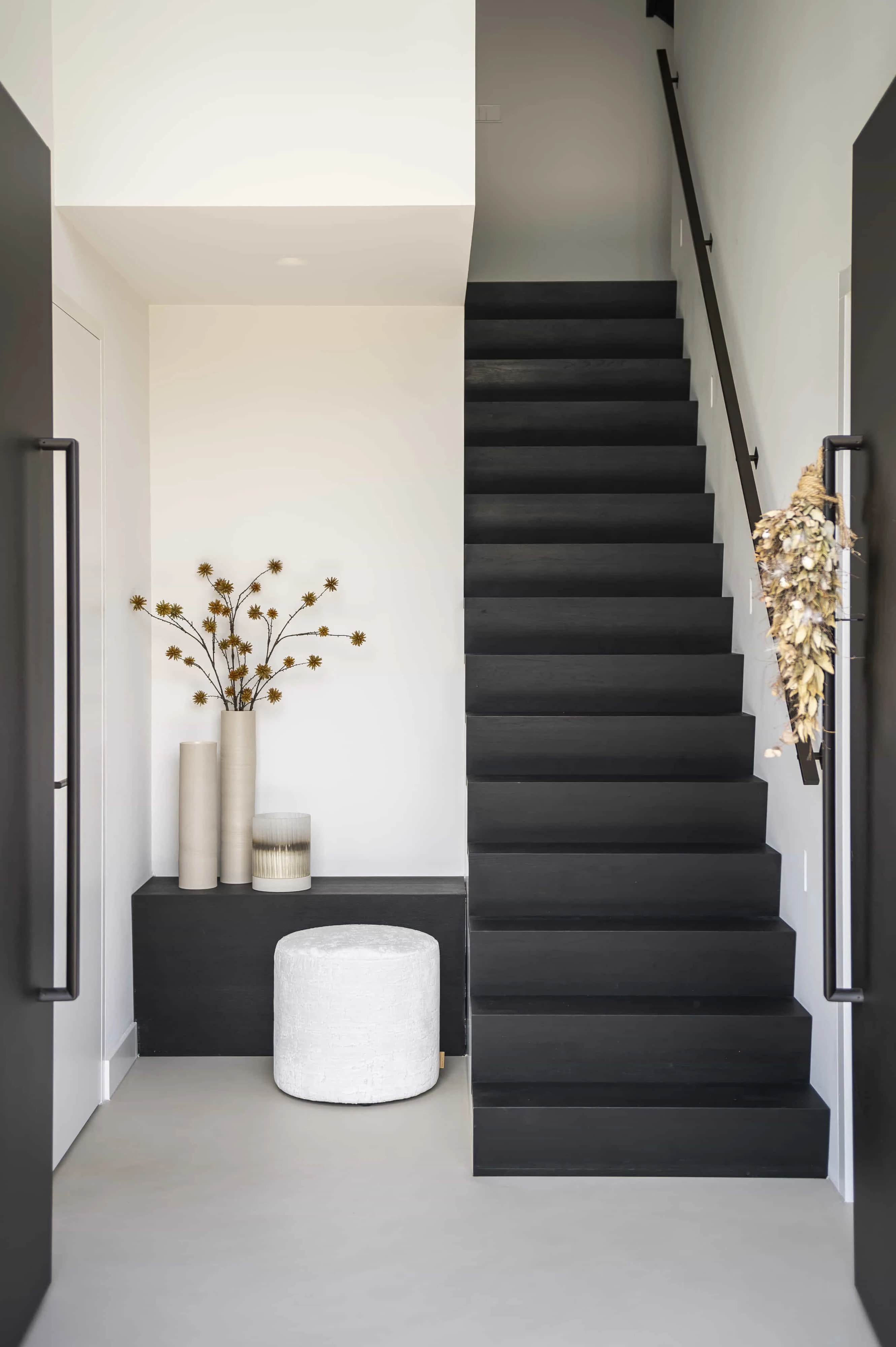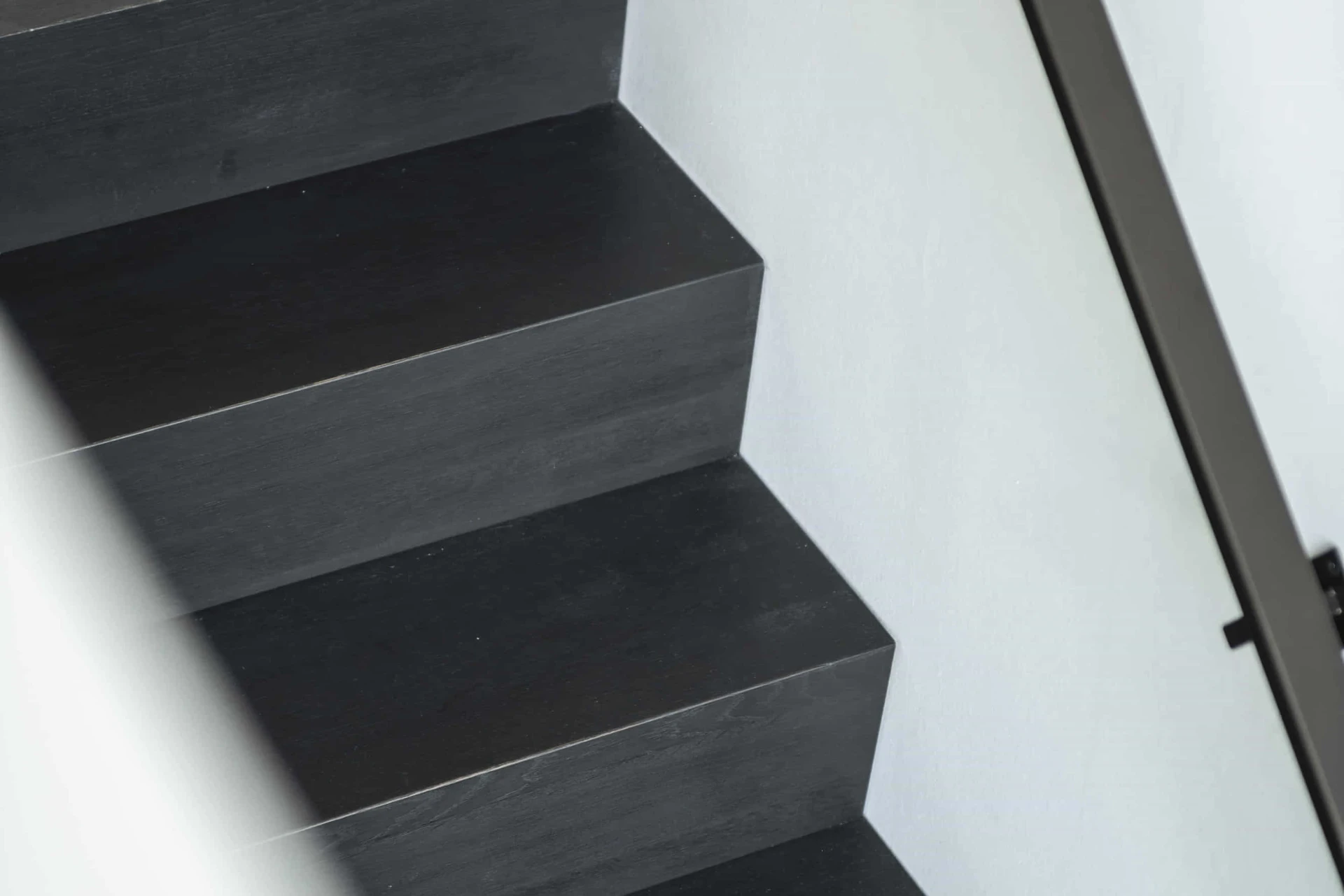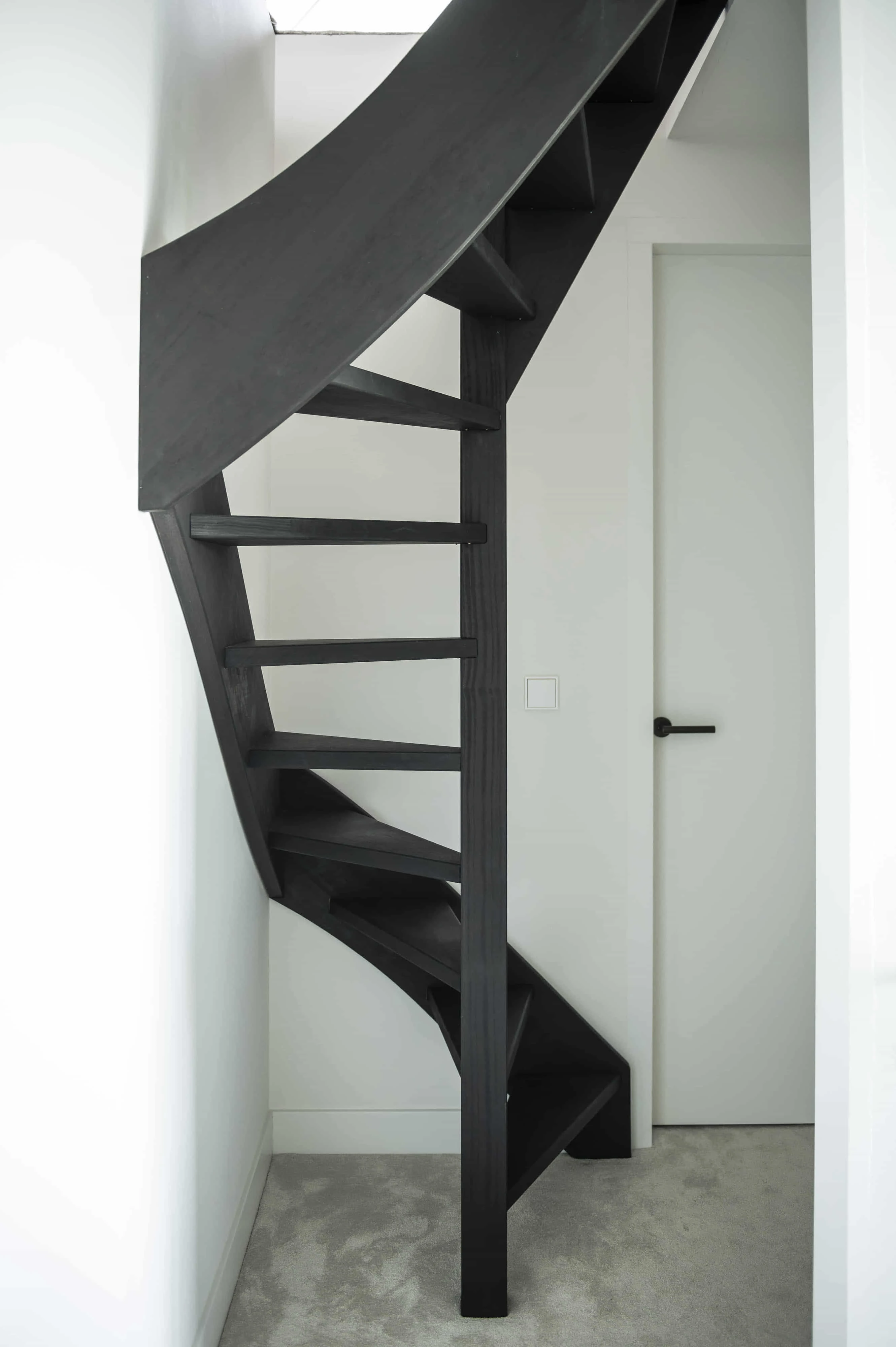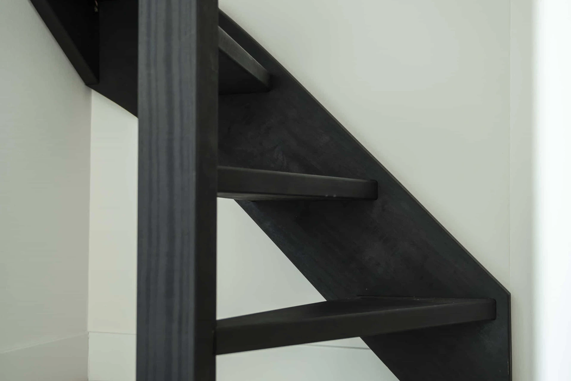Zwarte houten trap op maat, volledig afgestemd op de ruimte en het interieur. De trap is strak afgewerkt en vormt een krachtig element in de woning.